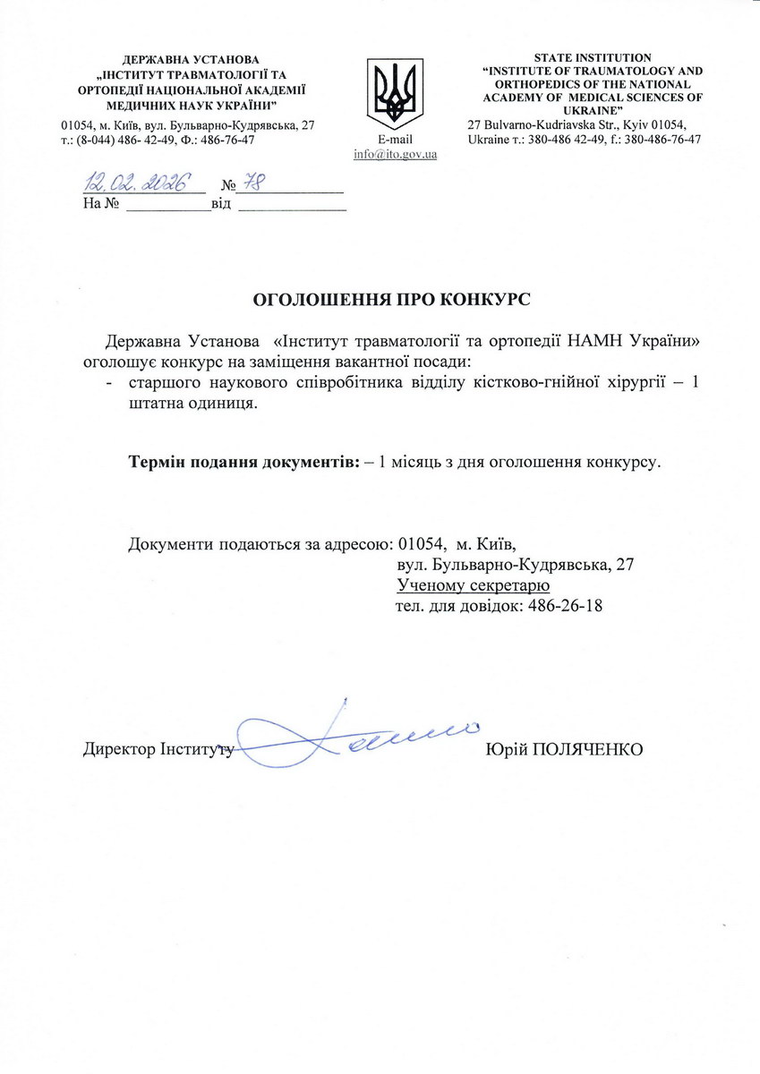 Опублікований: 12.02.2026ДУ "Інститут Травматології та Ортопедії НАМН України" оголошує конкурс на замішення вакантної посади старшого наукового співробітника відділу кістково-гнійної хірургії